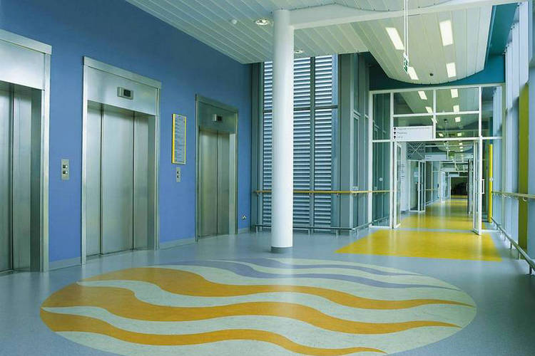 地板是構建醫院環境中的一份子。PVC彈性地板色彩豐富,顆粒、斑點或是圖案的設計令色彩搭配層次分明。例如在兒童病房,PVC地坪巧妙的色彩搭配,無形中消除了兒童對醫院的抵觸心理,起到了“視覺治療”的作用。在國外醫院廣泛采用的PVC地板,PVC地板具備古典的陶瓷色澤、典雅的木質圖案、自然色調的花崗巖等多種色彩和設計圖形。其采用的專利圓形邊緣設計,既可在地面的邊沿、墻角使用,又適用于圓形地面,具有無限的發揮空間。同時具有卷材和便于鋪設的彈性塊材,其相對薄的厚度和優秀的隔音與隔熱性能,能直接用于石材、陶瓷、木材等老式的地基面層上,更是醫院建設的不二之選。